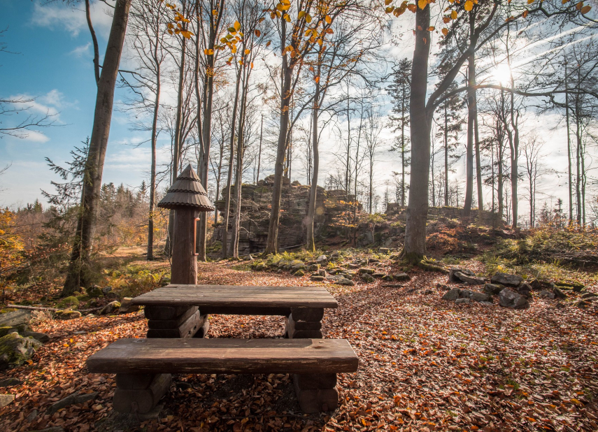 První vrcholy, které po cestě potkáte, jsou Malý Špičák a Popický vrch. Poté přichází na řadu náročnější terénní sjezd do Kostelce. Tady se vydejte do obce Hutě a dále na vrchol Čeřínek. Zpátky u rozcestníku Dolní Hutě odbočte na červenou značku k pozoruhodnému Čertovu hrádku, skupině mrazových srubů vytvářejících mohutnou žulovou skalní hradbu dlouhou asi 50 metrů.